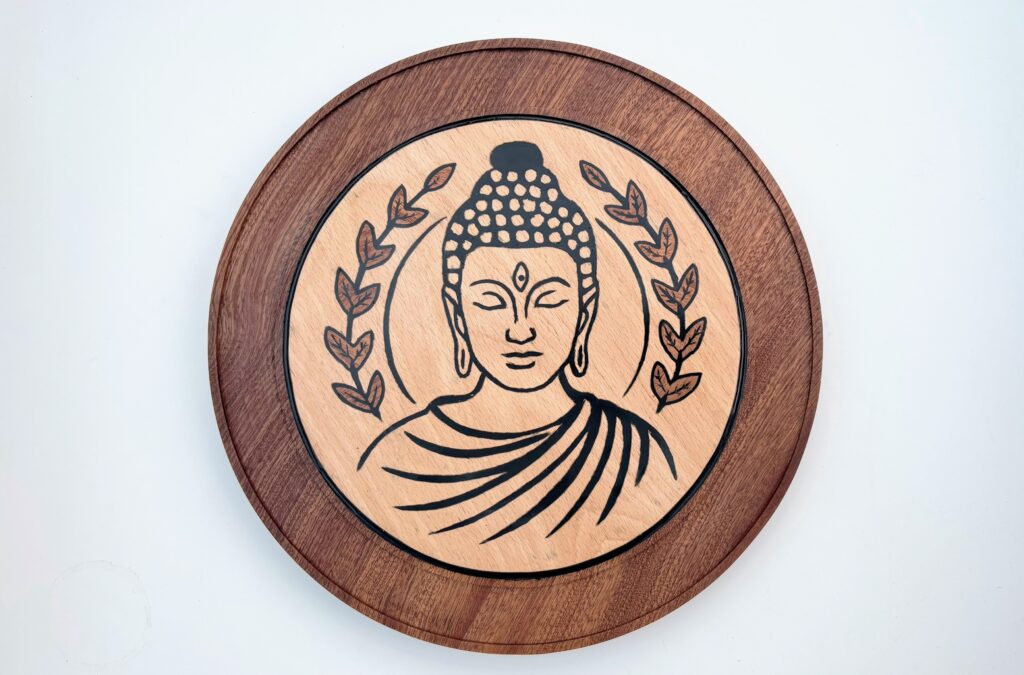This round wall plaque is handcrafted from rich Sapele and Beech hardwoods, creating a warm contrast between the deep reddish-brown outer frame and the lighter central panel. The serene Buddha design is carefully carved and enhanced with black epoxy, giving the image sharp definition and a smooth, refined finish.