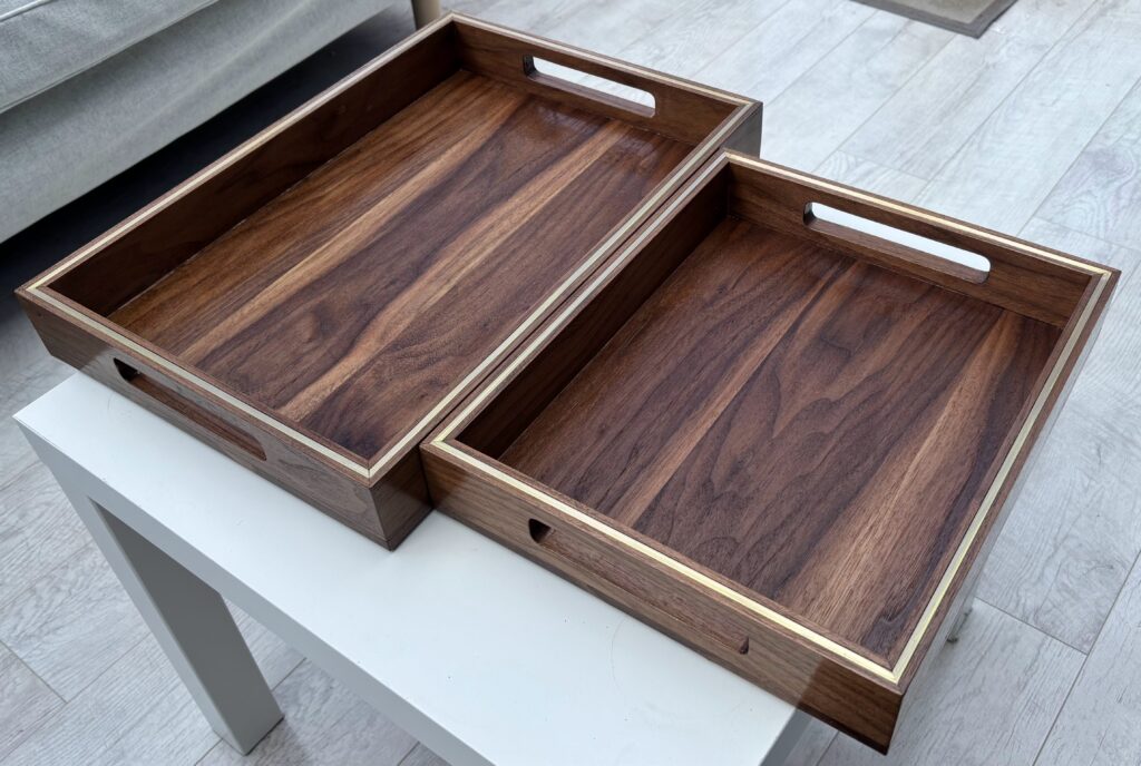 These handcrafted serving trays are made from solid Walnut hardwood, showcasing its rich, deep brown tones and beautifully flowing grain. Each tray is finished with a subtle brass border inlay, adding a refined detail that elevates the natural warmth of the wood.