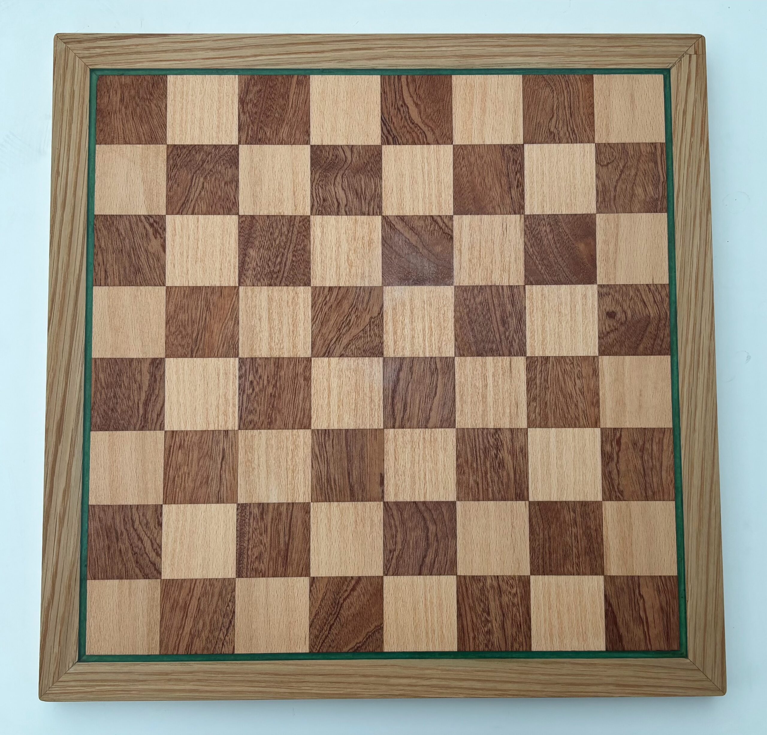 The board features a classic contrast of rich Sapele and light Beech, carefully arranged to create a clean, balanced playing field. Surrounding the board is a solid Oak frame, adding strength, durability, and a premium finish.