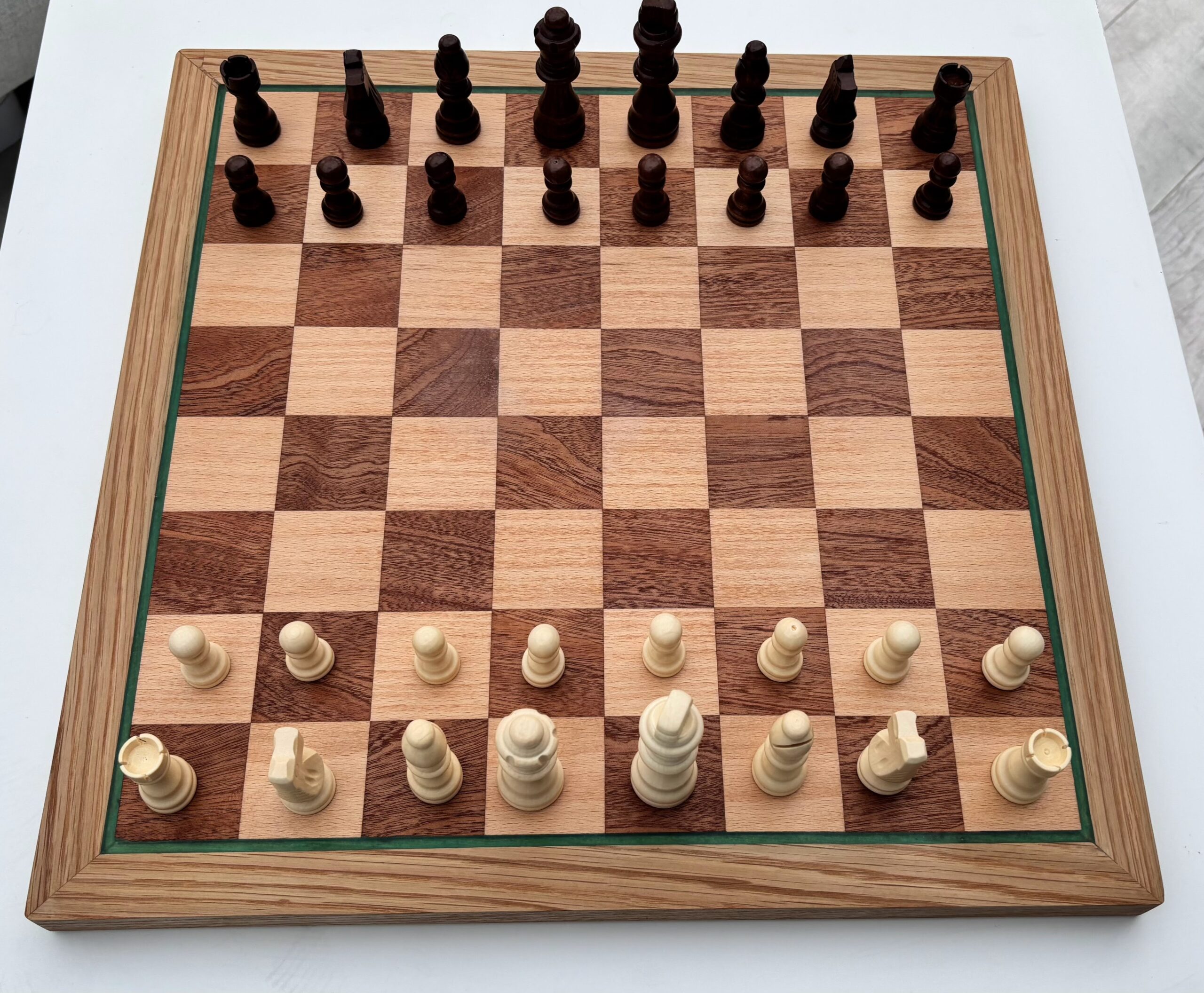 A distinctive green epoxy inlay border runs around the playing area, adding a subtle yet modern accent that sets this board apart from traditional designs.